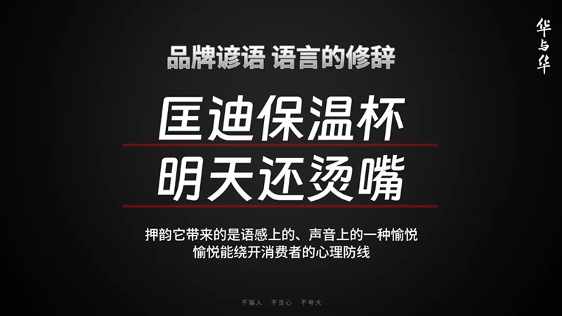 “匡迪保溫杯,明天還燙嘴”也押韻,押韻就能創造一種愉悅,而這種愉悅,它就能繞開消費者的心理防線。消費者不僅接受了,還很開心,開開心心就能說給別人聽,讓它易于播傳。