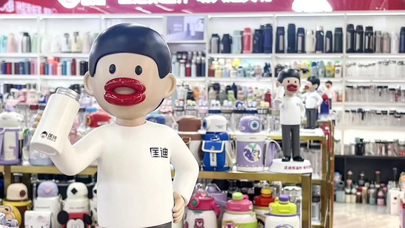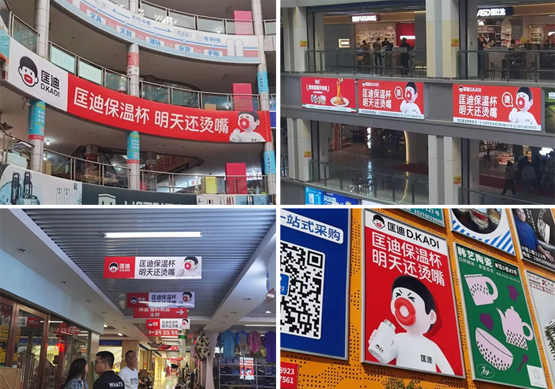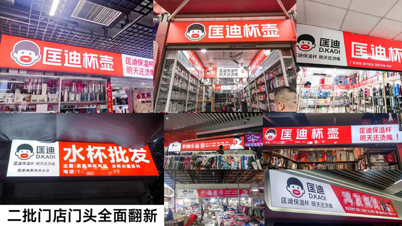 超級符號上門頭,讓它們在批發市場中成為最亮眼、最具吸引力的成交陣地,讓客戶的客戶也賺錢。當你走進批發市場,最先撲面而來的就是那醒目的匡迪保溫杯門頭。